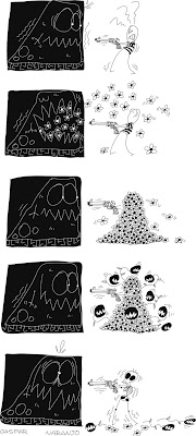 Como veis el estilo es "algo" diferente. De niño era un apasionado de "Superlópez" así que aprendí a dibujar con Jan. Años más tarde, ya en Bellas Artes, se produjo en mi estilo de dibujo un punto de inflexión buscando la simplicidad, lo que veis hoy en día.