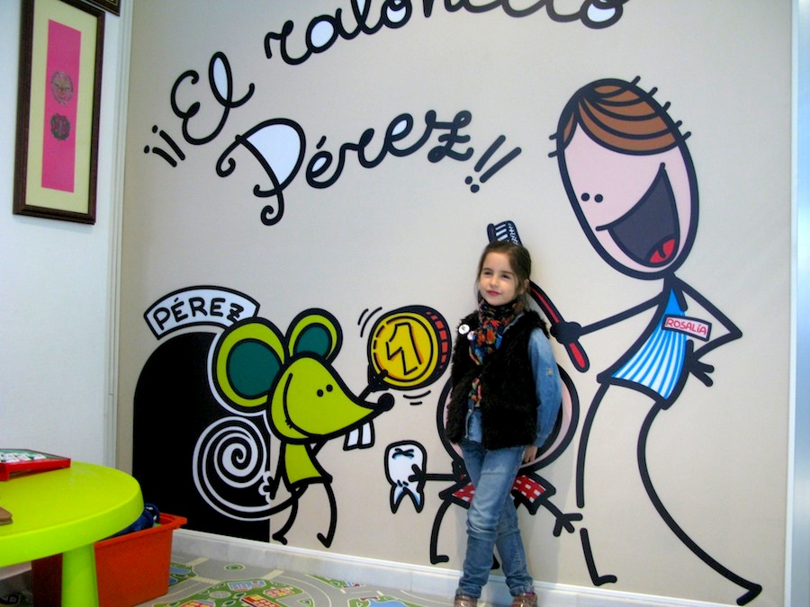 Este es otro de los trabajos que he estado realizando últimamente. Se trata de un mural en para la cínica dental Rosalía Bellón. La idea era darle un tono cálido y divertido a la zona infantil y por extensión a toda la sala de espera donde se ubica. Es una impresión sobre lona, y el acabado es genial, todo un descubrimiento para mis dibujos. ¡Espero que así duelan menos los dientes! Gracias a Luna por posar y a Rosalía por confiar en mi trabajo.